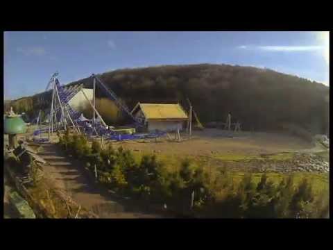 Aber nun hinaus aus der Stadion. Dafür erklimmt man den 33 Meter hohen Lift mit einem klassischen Kabellift, welcher aber nach erreichen der 45° Steigung noch einmal kräftig Fahrt aufnimmt. Somit erreicht der Zug zwar nicht die werbewirksamen 100 Stundenkilometer, doch reichen 83 Kilometer pro Stunde auch für einen kräftigen, aber angenehmen Druck in der ersten bodennahen Kurve. In den hinteren Reihen gibt es dazu ordentliche Airtime beim Verlassen des Liftes. Das Layout was dann folgt, ist sehr ähnlich zu den bekannten Intamin Mega Lites. Die für den deutschen Achterbahnfreund näheste Auslieferung ist Piraten im Djurs Sommerland, welche auch Vorbild für Alpina Blitz war, wie man in dem Screenshot aus einer Baudokumentation sehen kann. Hier wird vor allem der Wechsel der Fahrelemente im mittleren Bahnteil deutlich, die sich dennoch sehr ähneln. Ein Point-Of-View-Video findet ihr am Ende des Artikels.
